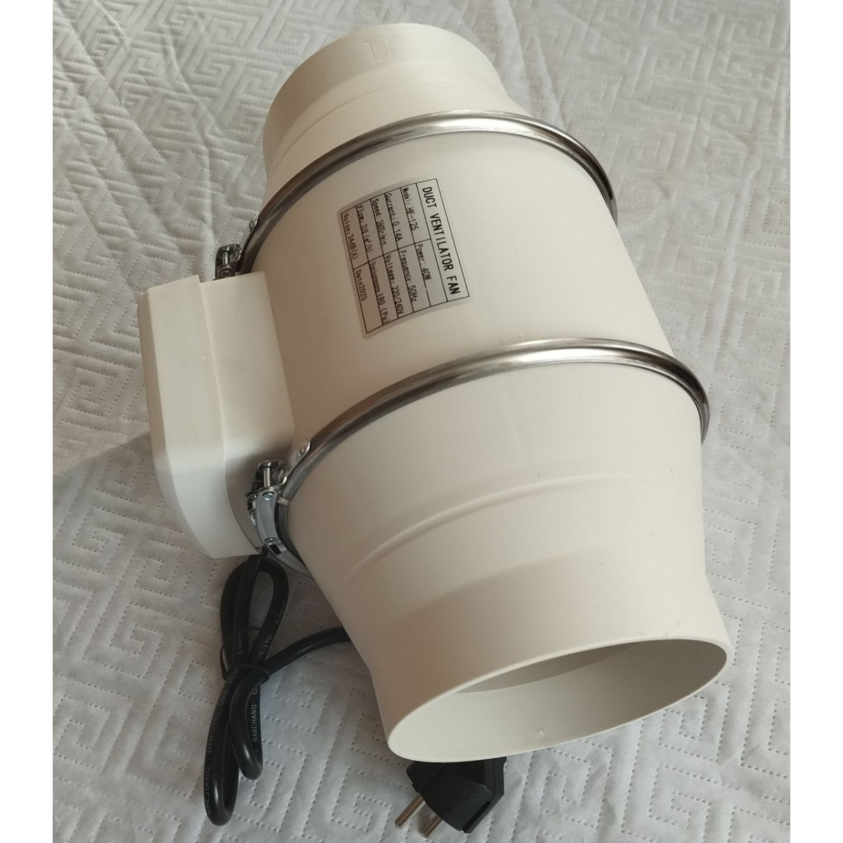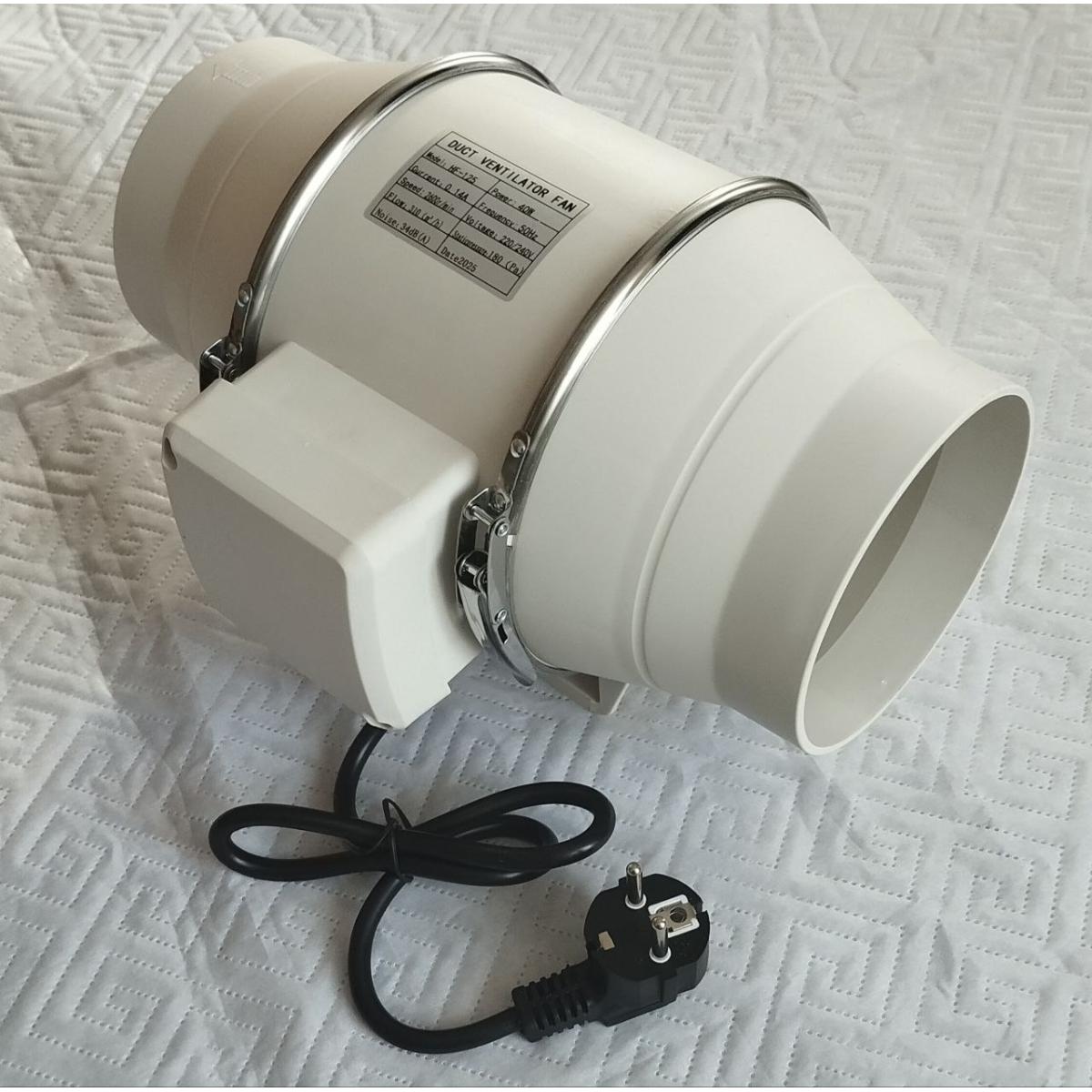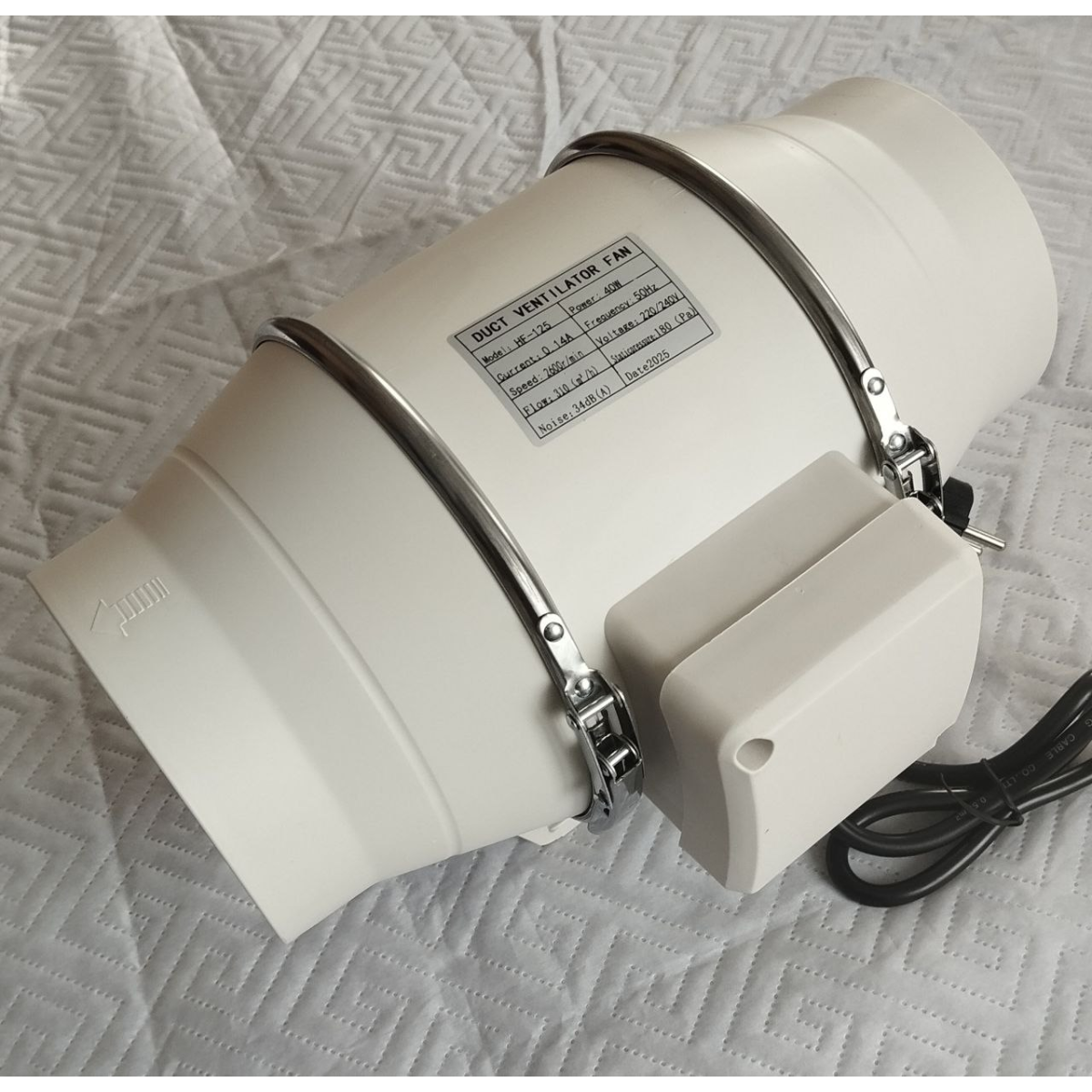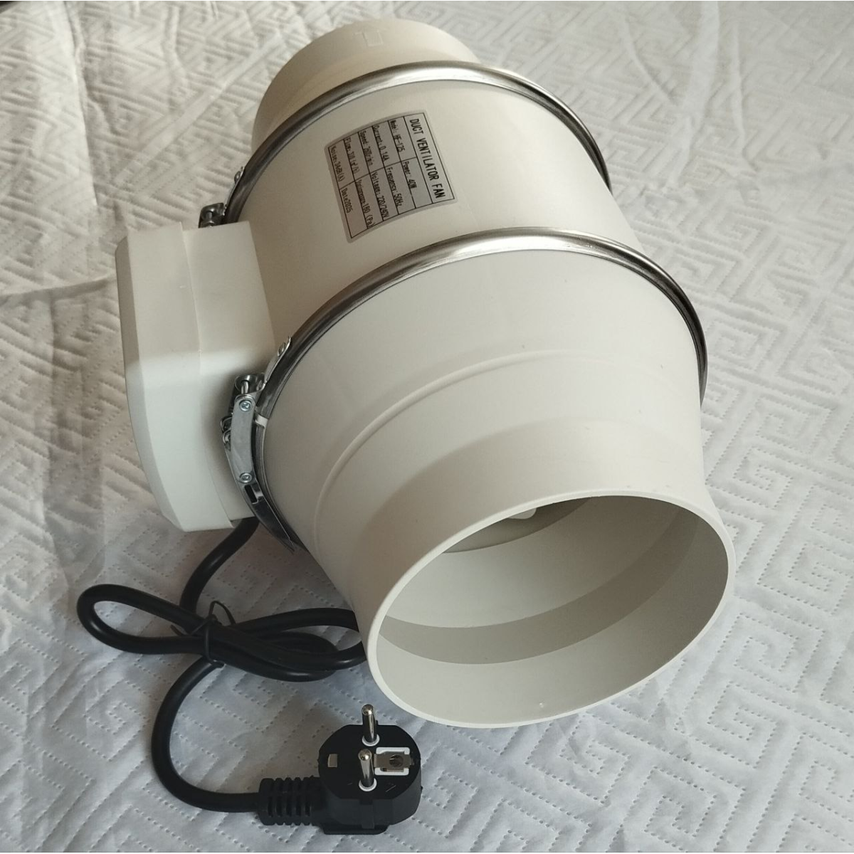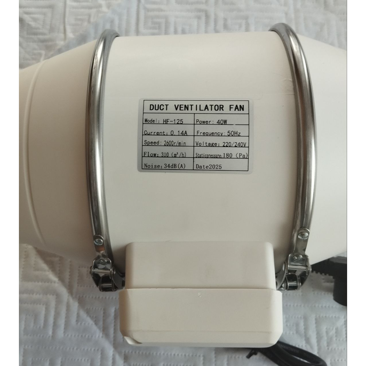 220/240V, 50Hz, 0,14А, 310m3/h, 2600r/min, 180Pa, 40W, 34db.